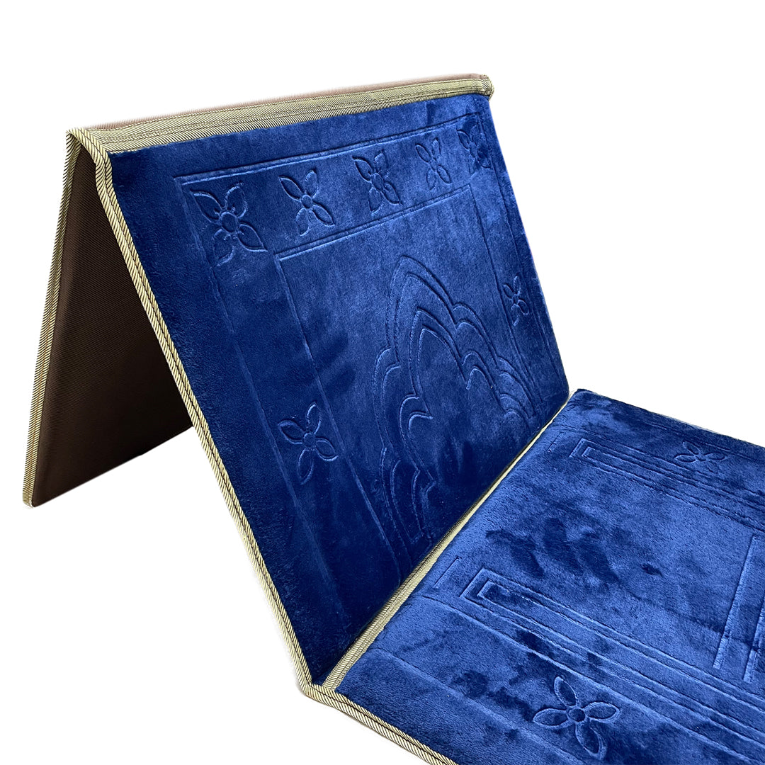 A high-quality, foldable prayer mat designed for travel. Features a backrest and carrying handle for convenience. Ideal for Ramadan, Hajj, Umrah, or as a thoughtful gift for loved ones.