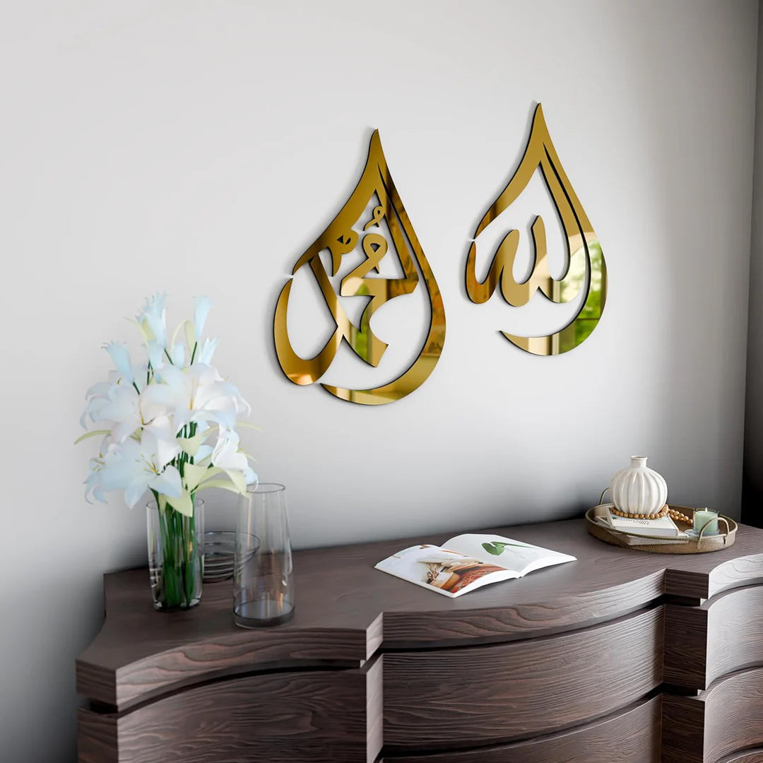 Elevate your space with this stunning Acrylic Mirror Metal Decor, featuring the beautiful names of Allah and Muhammad (SAW) in elegant Islamic calligraphy. Crafted from premium golden acrylic (5mm thick), each piece reflects light beautifully, creating a modern yet spiritual ambiance in any room.