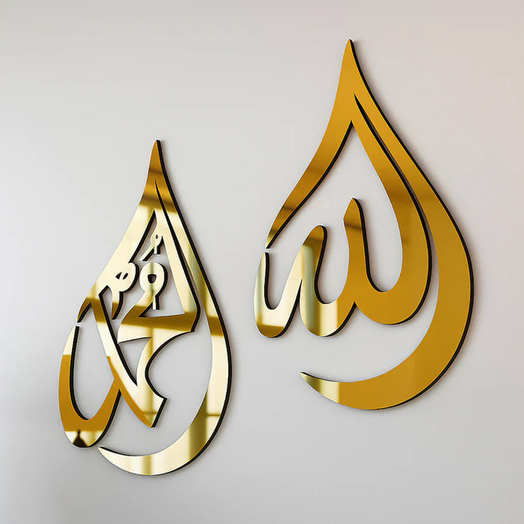 Elevate your space with this stunning Acrylic Mirror Metal Decor, featuring the beautiful names of Allah and Muhammad (SAW) in elegant Islamic calligraphy. Crafted from premium golden acrylic (5mm thick), each piece reflects light beautifully, creating a modern yet spiritual ambiance in any room.