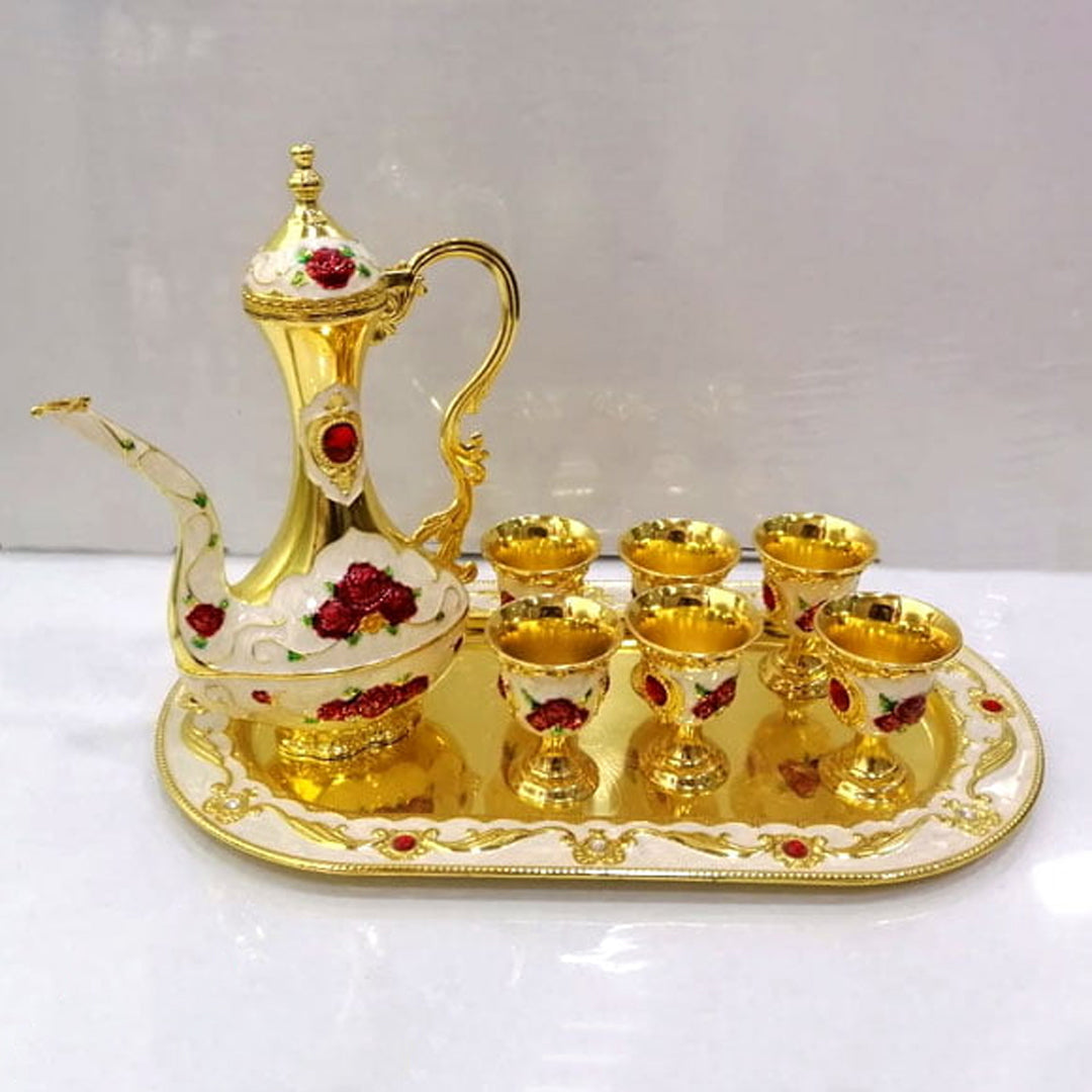 Each cup will hold approximately 1.5 oz of tea or coffee.The round tray measures 12″ in diameter and the Teapot is 11″ tall. Each piece is etched with an elegant design, then polished and painted with a silver finish. Colorful stones are inset into each piece for a truly luxurious style