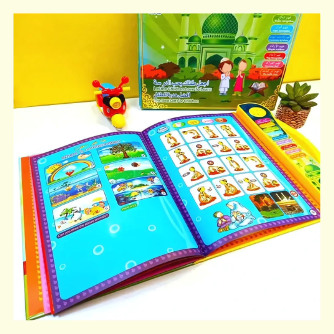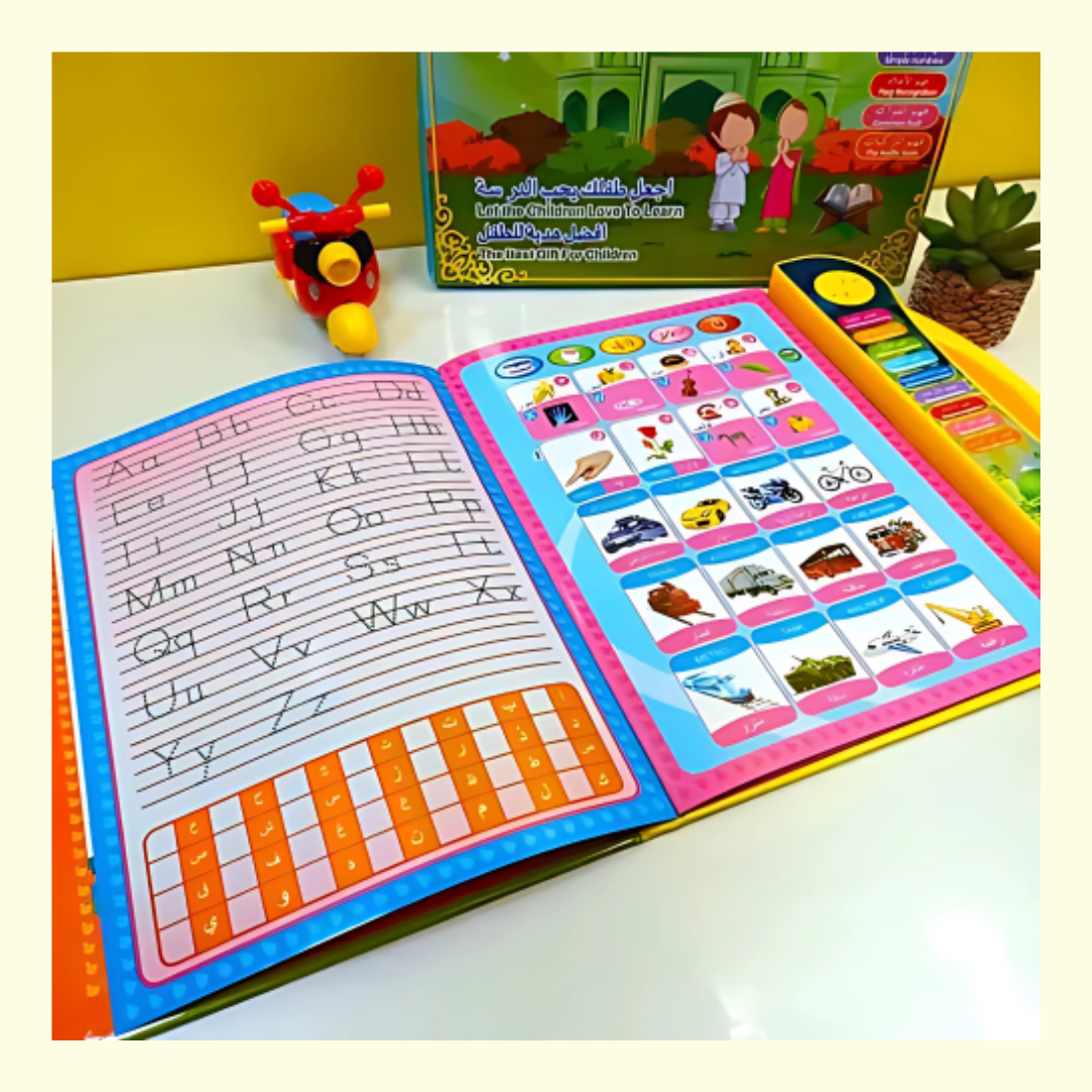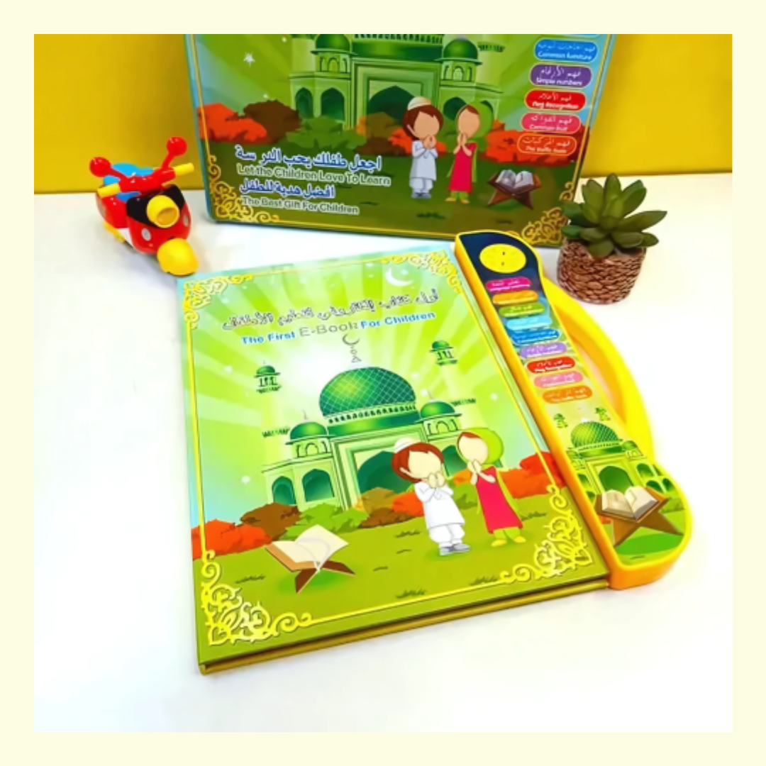 Alf- Mabrook introduce Islamic E-Book for Children Comprehensive Content Includes a hundred-page machine learning book, covering diverse subjects from animals to math. Multilingual Learning: Engage young minds with an English and Arabic e-book, fostering bilingual skills from an early age. Safe and Durable:Constructed from high-quality PE plastic, ensuring a safe and long-lasting learning experience. Educational Toy: Designed as an educational toy, this Quranic Arabic language course is both fun and informative. Interactive Learning: Features haptic interaction and audio, enhancing learning through touch and sound.