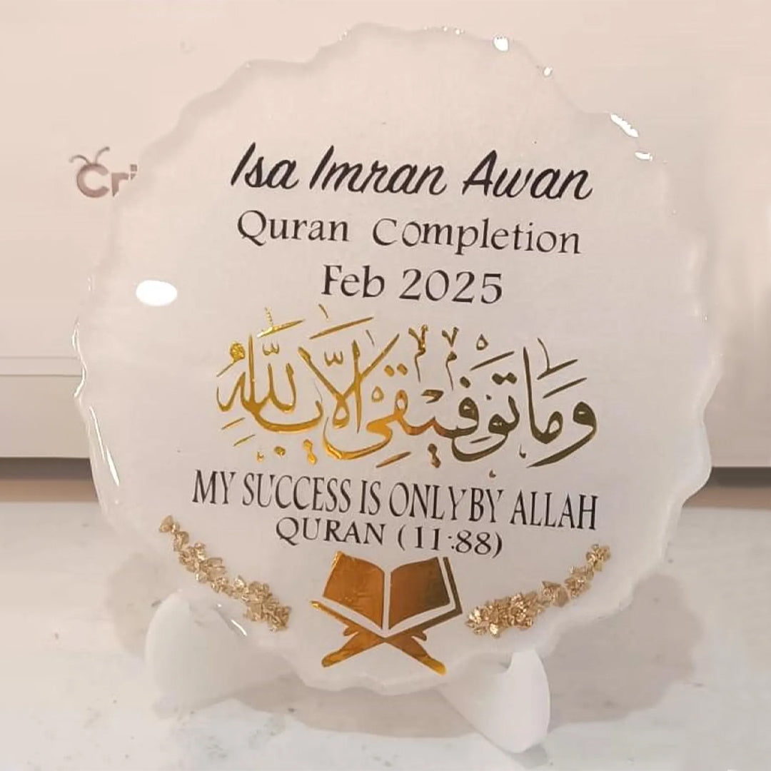 Personalised Resin Quran Completion Plaque with Stand & Custom Name Hifz Completion Islamic gifts Graduation Gift - My success is only by ALLAH Commemorate a special milestone with this elegant personalised resin Quran completion plaque, featuring a beautifully designed Arabic Quran verse 5x5inch