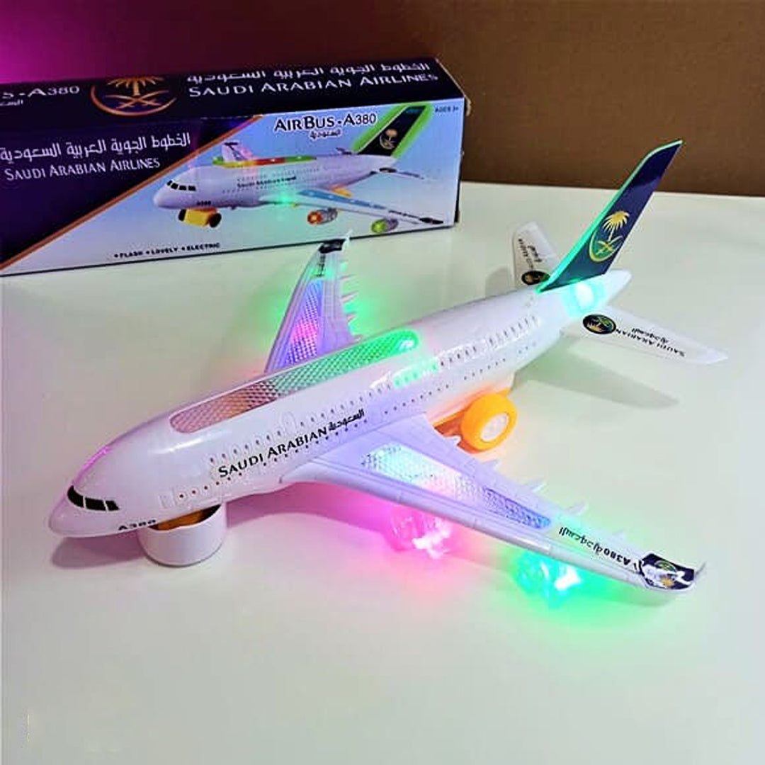 Take flight with this exciting Saudi Airlines airplane toy featuring lights, sound, and bump-and-go movement.